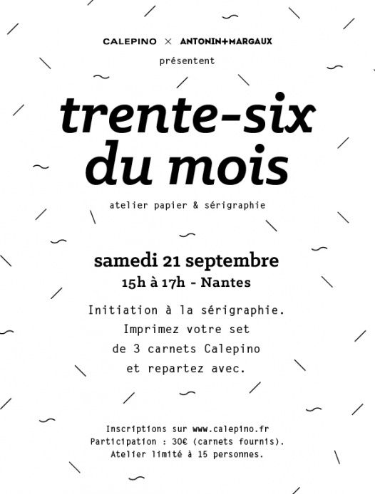Calepino & Antonin+Margaux organisent le « Trente-six du mois« , leur premier atelier papeterie et sérigraphie ouvert à tous, le 21 septembre à Nantes.